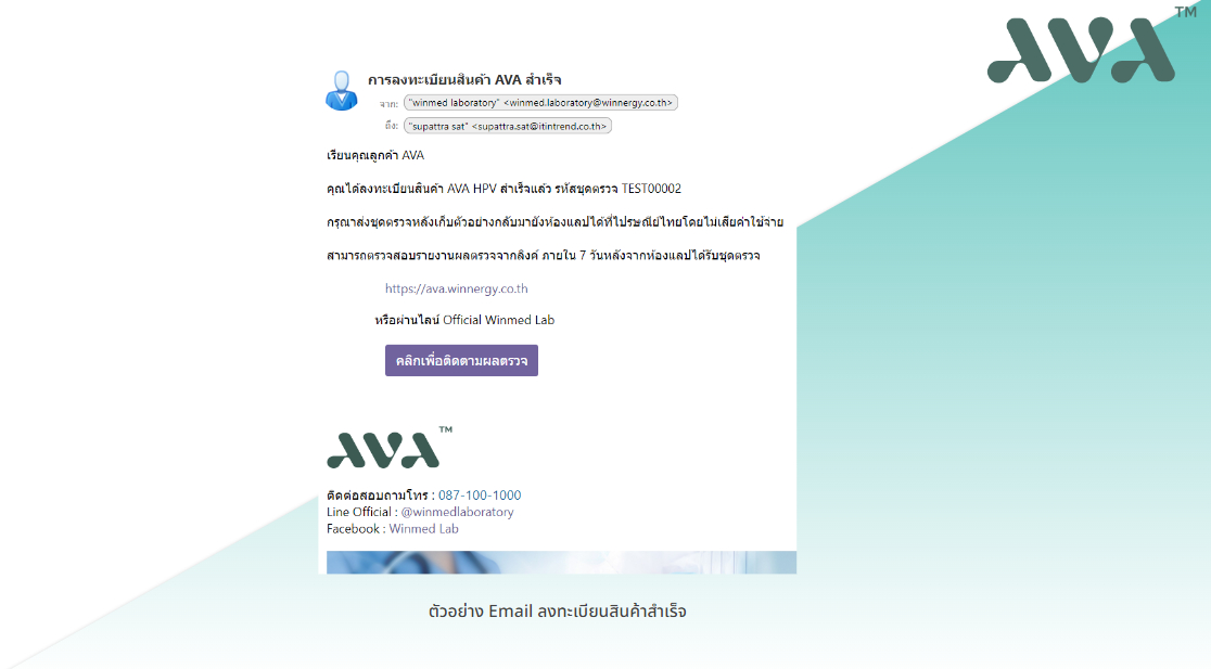 หลังจากการลงทะเบียนภายในระบบสำเร็จระบบจะส่ง Email เพื่อ Confirm ว่า การลงทะเบียนของลูกค้าสำเร็จแล้ว ดังภาพ