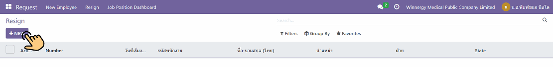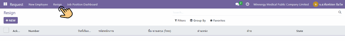 2. เลือกเมนู Resign จากเมนูด้านบน จากนั้นกดปุ่ม + NEW เพื่อสร้างเอกสาร