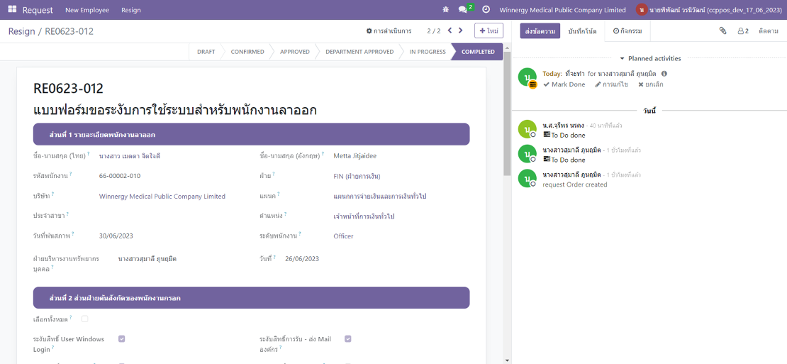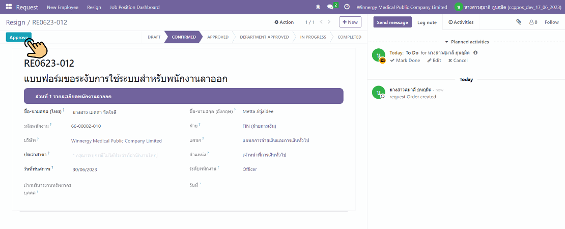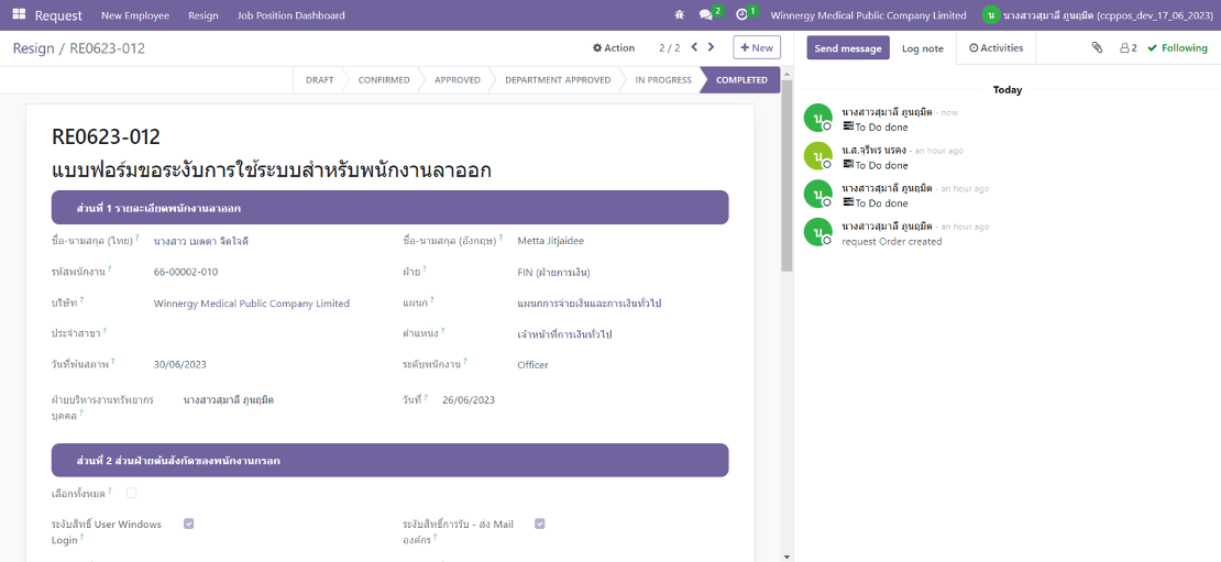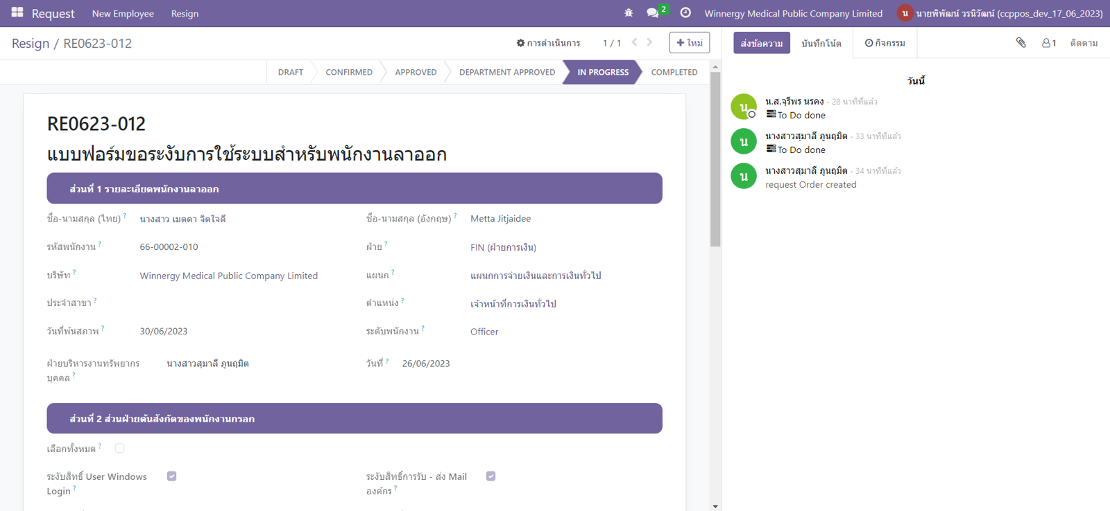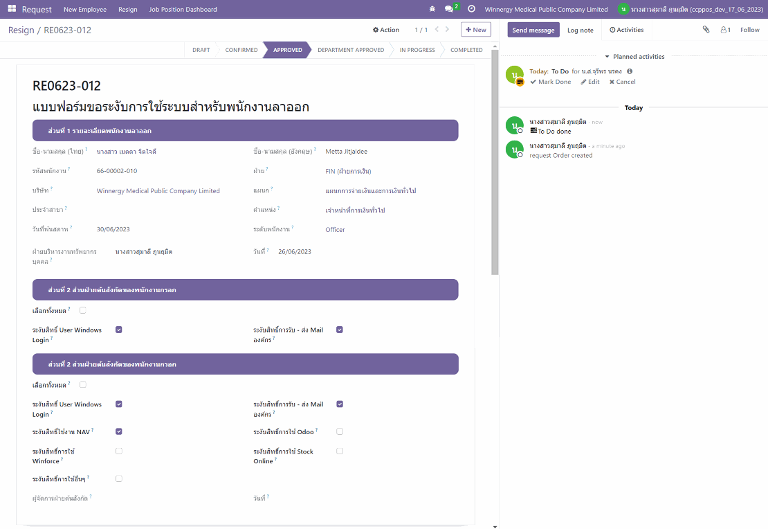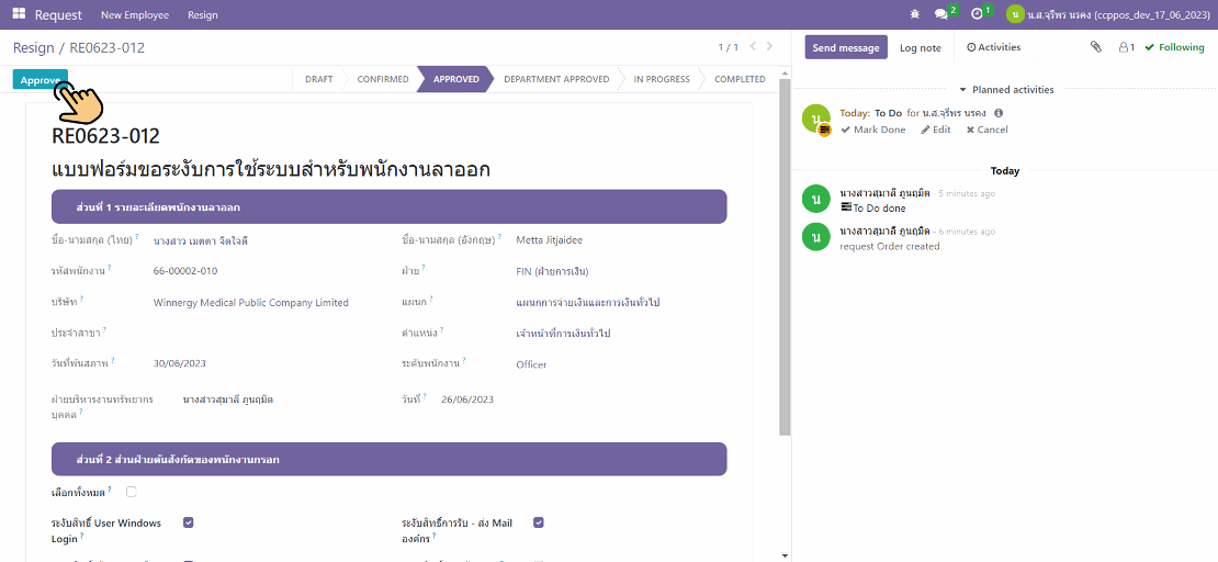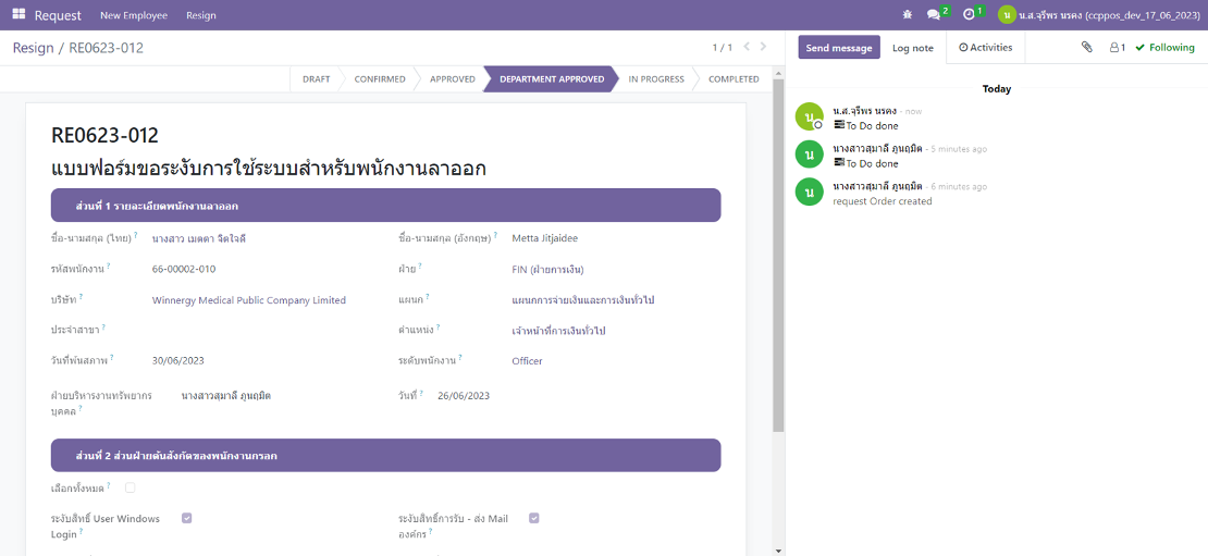 4. สถานะของเอกสารจะถูกเปลี่ยนเป็น Department Approve และส่งต่อไปยัง IT Team เพื่อทำการระงับสิทธิ์ต่อไป