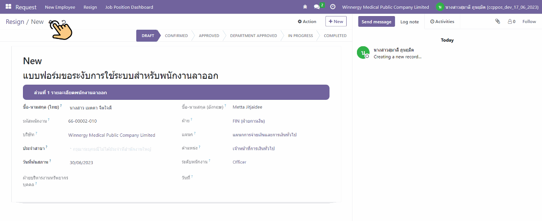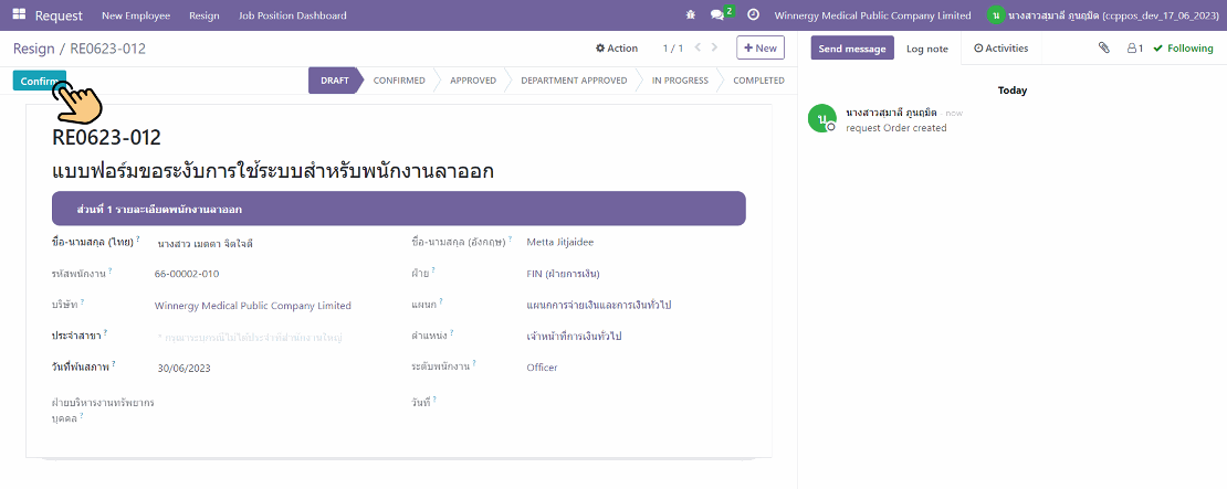2. เมื่อกรอกข้อมูลเรียบร้อย กดปุ่มเพื่อบันทึกเอกสาร จากนั้นกดปุ่ม Confirm เพื่อส่งเอกสารไปยัง HR Manager
